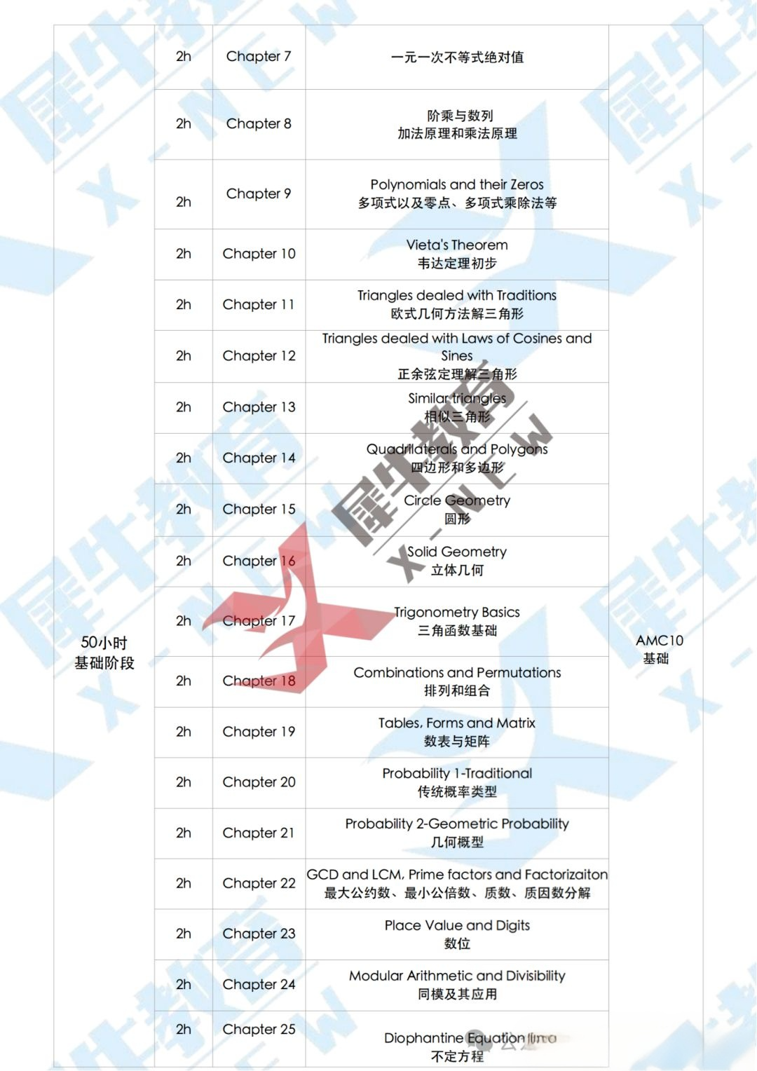 犀牛AMC10培训课程基础段学习采用的是自家内部的AMC10培训教材,有明确的学习范围节点,50h的时间,帮助同学们搞定代数、几何、数论、组合几大模块的内容。