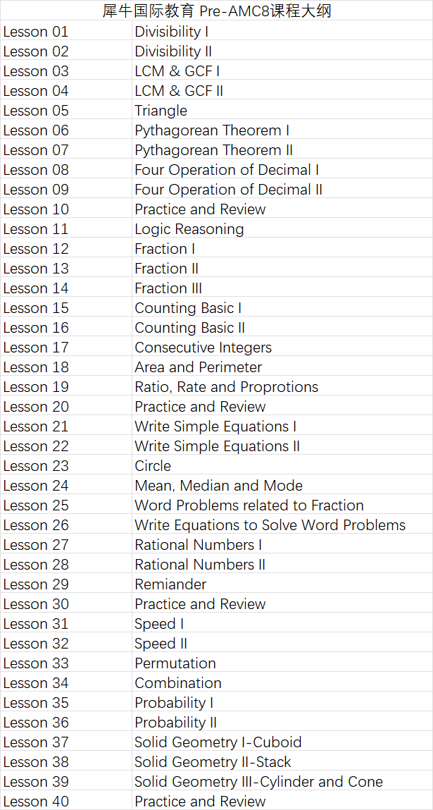 犀牛针对不同基础与目标的学生,提供AMC8/10/12数学竞赛培训课程,分别开设AMC8/10/12基础班、AMC8/10/12强化班、AMC8/10/12冲刺班等不同班型课程,无论孩子是0基础还是强化冲击奖项,都能在犀牛找到适合孩子的课程安排~