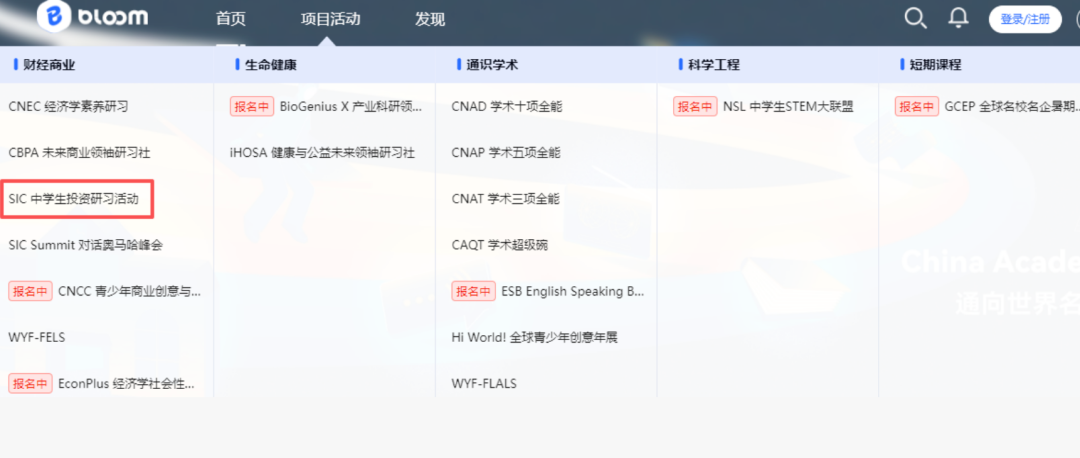 入口路径:项目活动 → SIC 中学生投资研习活动 → 立即报名