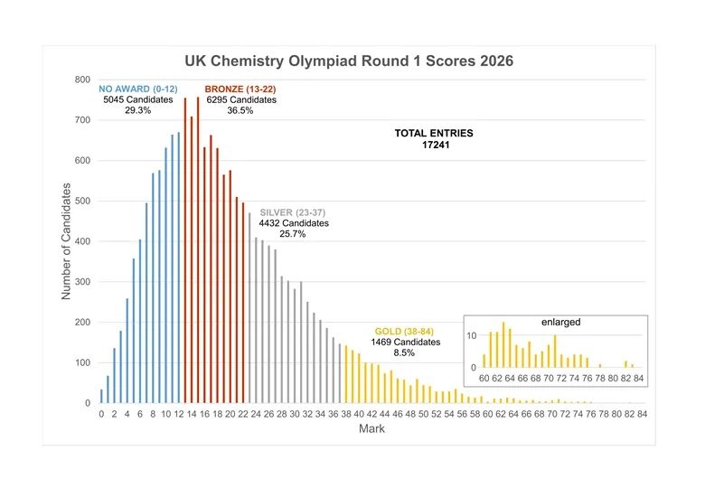 英国皇家化学会(RSC)公布了2026 年英国化学奥林匹克竞赛(UKChO)第一轮的分数线,超过70%的参赛选手斩获金、银、铜奖项。今年的整体平均分和分数线均显著高于 2025 年。