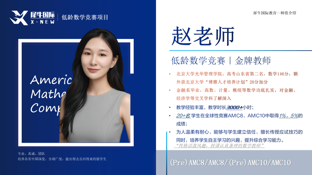 犀牛AMC8培训课程开课以来,一批老师深受学生和家长喜爱,下面给大家列举一些犀牛AMC8老师