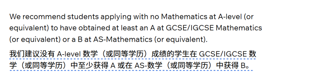 而作为Alevel的衔接课程,一些专业也允许学生在未达到相关Alevel成绩的情况下使用GCSE/IGCSE成绩代替,之前我们经常举例的KCL化学及相关专业,对于没有Alevel数学(或同等学历)成绩的申请人来说,可以凭借GCSE/IGCSE数学(或同等学历)中拿到A的成绩代替申请。