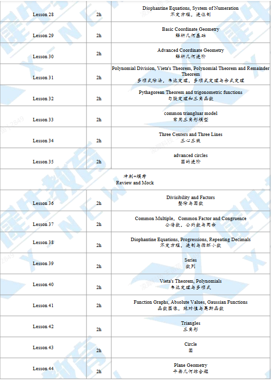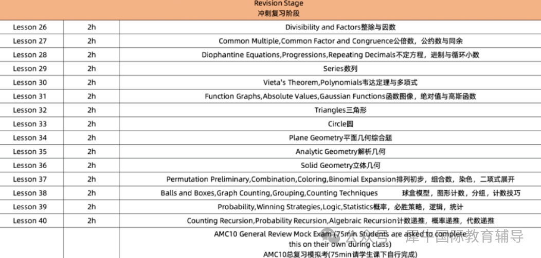 课程内容:AMC10的基础知识辅导,从数论,代数,几何和组合,四大核心知识点的基础知识强化与完善为主,授课内容包含AMC10必考的余数与同余、不定方程、幂运算与根式,韦达定理,多项式除法等知识点。