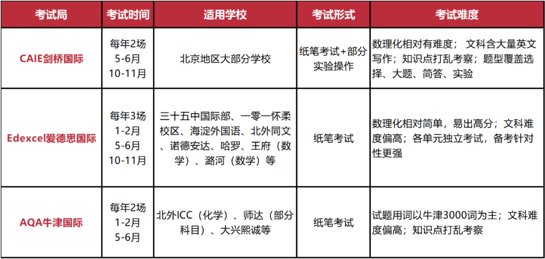 北京地区主流考局为 CAIE、Edexcel 国际、AQA 国际三大类,适配不同国际学校 / 国际部。