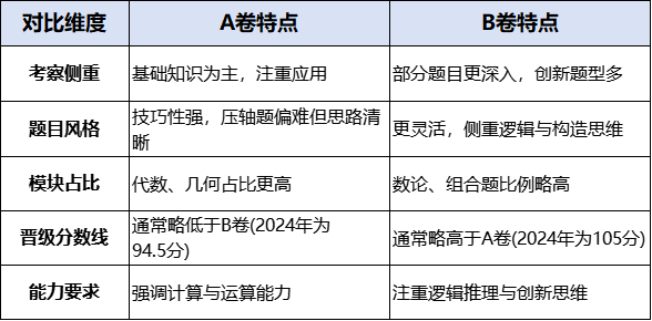 B卷题目区分度更高,数论、组合等创新题型能更好地展现优势,更容易在高分段脱颖而出。