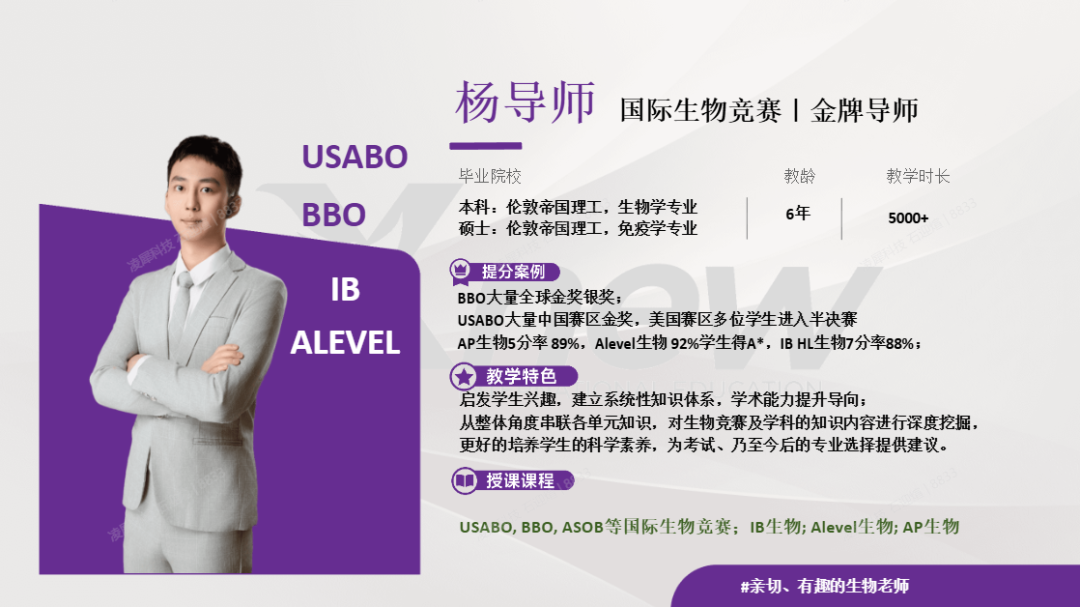 长期深耕 BBO、USABO、InBO、Brain Bee 等生物类竞赛教学,精准把握赛事考点与科学备赛逻辑;