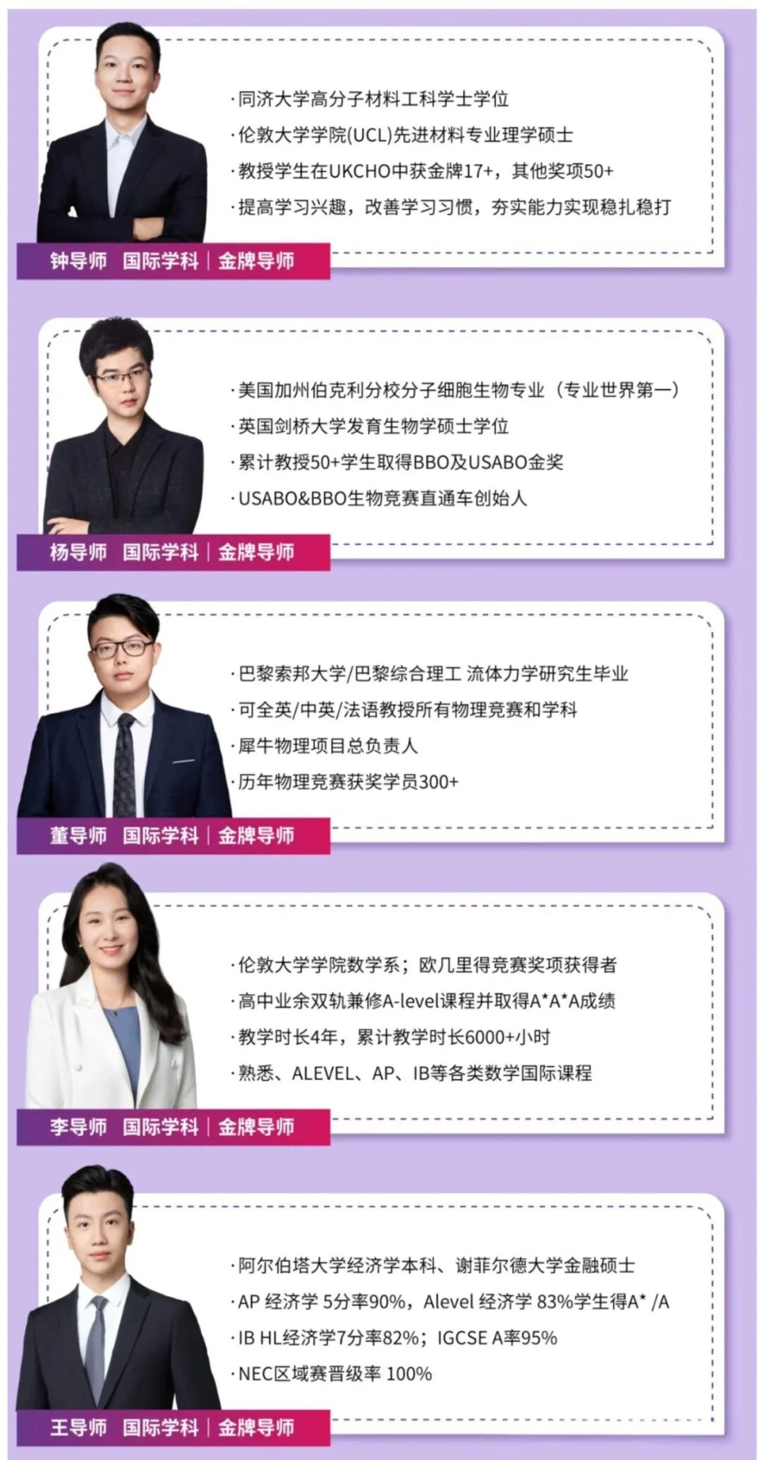 师资均为海内外名校硕博,均来自牛剑G5、藤校等全球Top院校,持ALevel官方教学认证,80%有海外留学背景,深谙三大考试局命题规律。