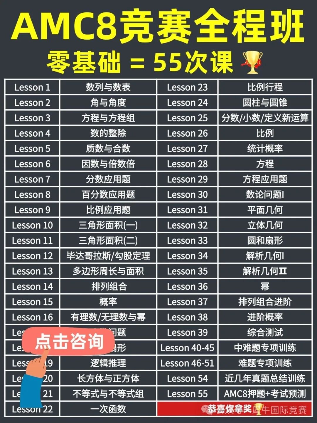 AMC8基础课程25次课:带你补充未学内容(小学校内数学知识点+小奥+初中7/8年级校内知识点)并夯实基础,学完达到AMC815+成绩