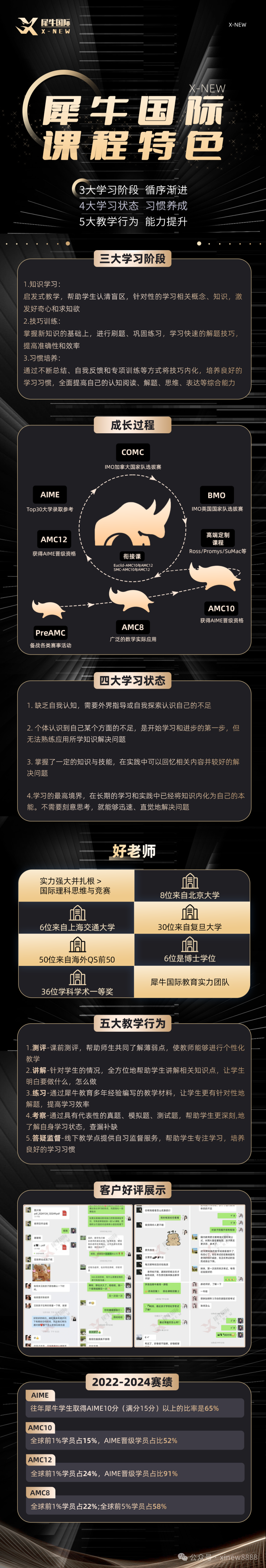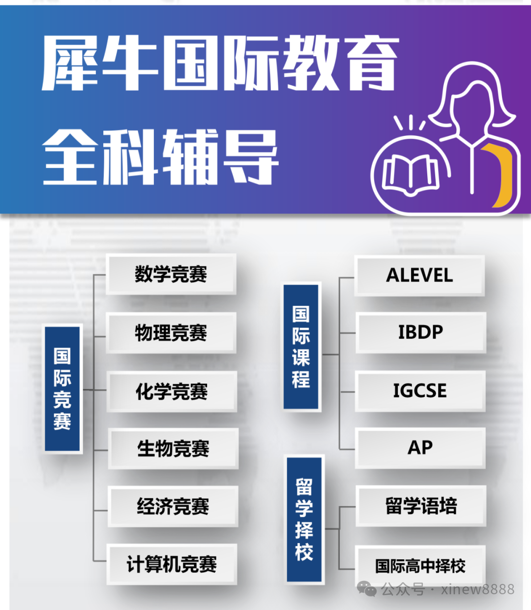 犀牛国际(X-NEW)主要为广大学生和家长提供国际教育领域的咨询与规划服务,根据学生的实际需求,在学科同步辅导、竞赛培优冲奖、G5牛剑笔面,国际择校,语培和标化等方面综合规划,短时间内帮助学生提升综合硬实力,以在未来申请学校过程中,拥有更为突出的背景!