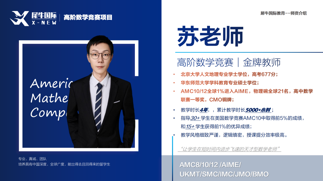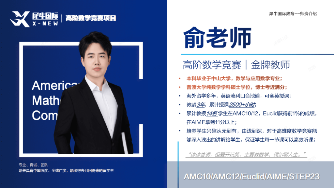 高中时曾获AIME 14分;主要从事AMC/AIME等数学竞赛的教学,ITCCC官方认证的Duke Math Meet教练~