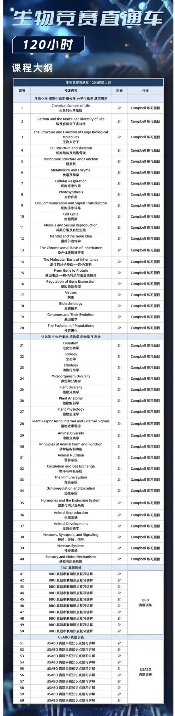 课程亮点:G5牛校师资团队,3-8人小班/1V1辅导,OMO线上/线下同步授课,帮助学员在高含金量生物竞赛中冲分拿奖,为学员申请藤校G5等名校的生物医学相关专业增分添彩!