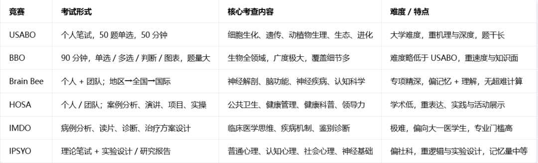USABO/BBO/BB/HOSA/IMDO/IPSYO综合对比