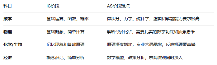 知识量爆炸:AS阶段的内容量通常是IG的2-3倍,而且不再停留在“是什么”,而是深入“为什么”和“怎么用”。比如数学突然出现微积分,物理开始解力学方程,经济要建模型。