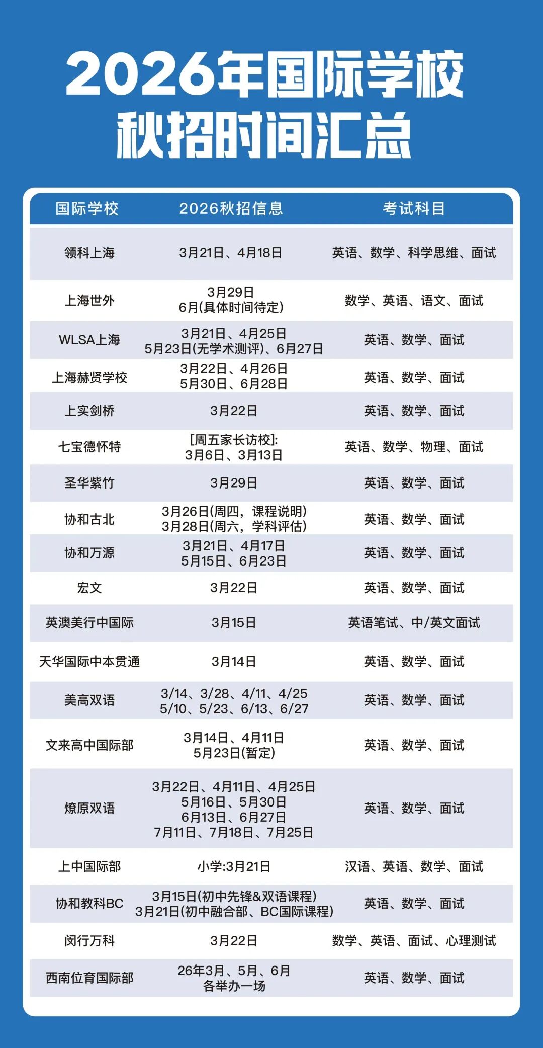 目前,2026上海国际学校秋季招生工作已正式启动,领科、WLSA、世外、赫贤、协和等一众顶尖热门院校,均已陆续公布了今年秋季招考的关键时间节点。