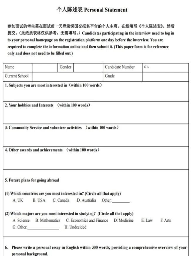 个人陈述可以提前准备!里面会写学生的成绩,过往参加的活动获得的奖项等,还有300-500字的essay[SEE EXAMPLE],面试一部分问题会围绕学生提供的这份ps问。