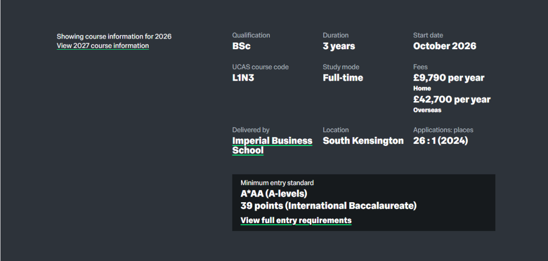 作为帝国理工商学院的王牌本科专业,该专业常年处于“全球最热门专业前三”行列,2024年申请竞争比高达 26:1.意味着26人争夺1个名额。