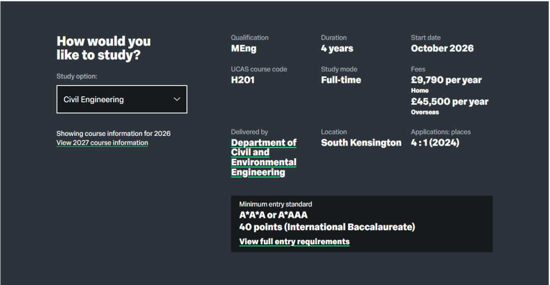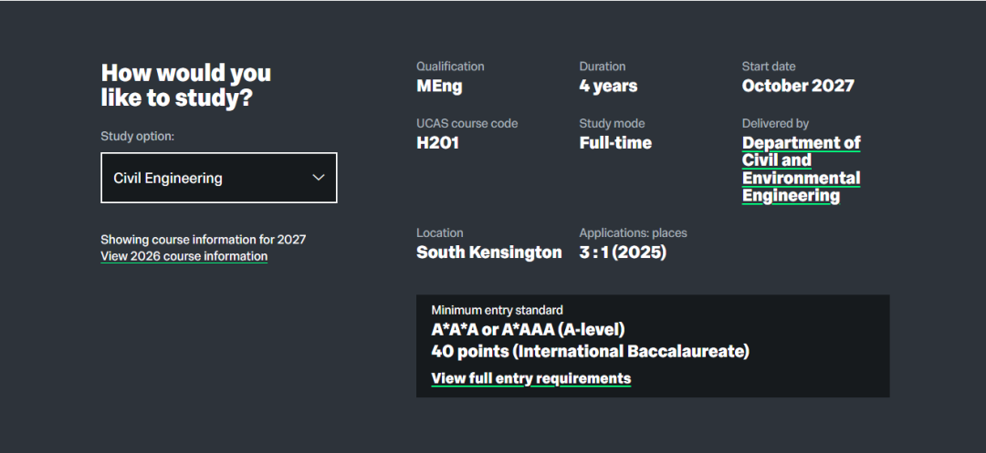 根据帝国理工官网显示,2027年土木工程专业入学要求如下↓
