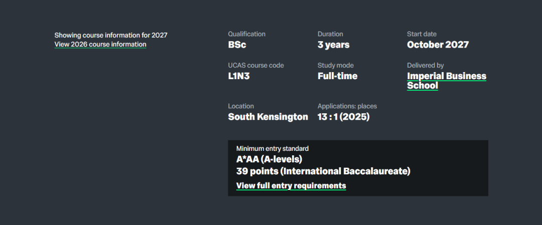 根据帝国理工官网显示,2027年经济、金融与数据科学专业入学要求如下↓