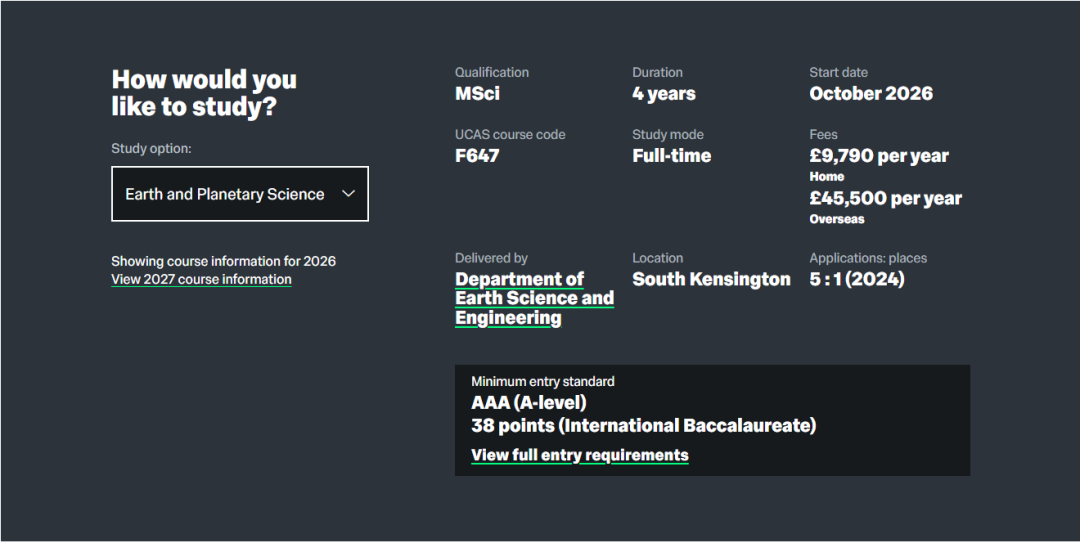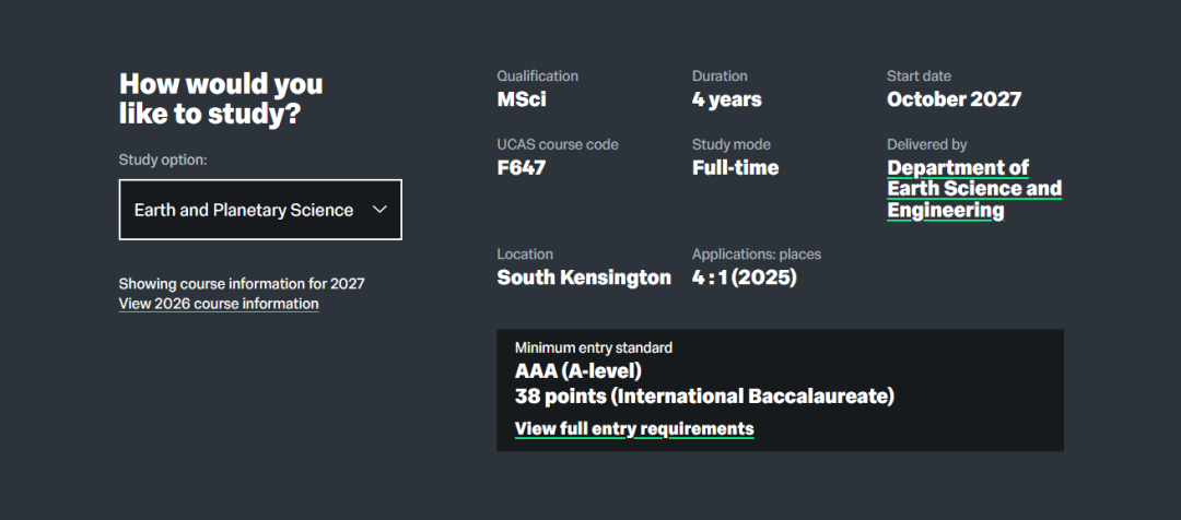根据帝国理工官网显示,2027年地球与行星科学专业入学要求如下↓