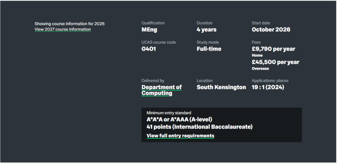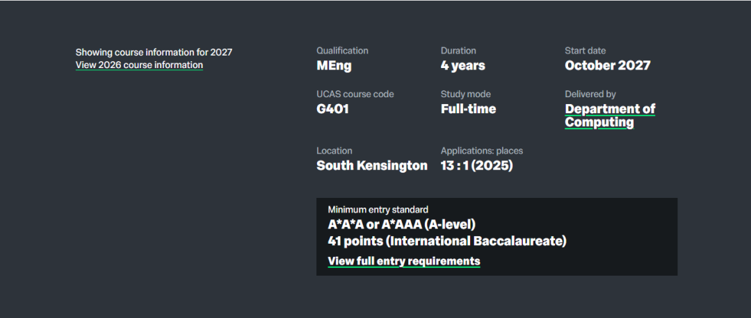 根据帝国理工官网显示,2027年计算机专业入学要求如下↓