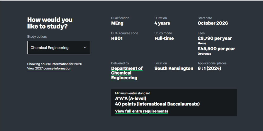 根据帝国理工官网显示,2027年化学工程专业入学要求如下↓