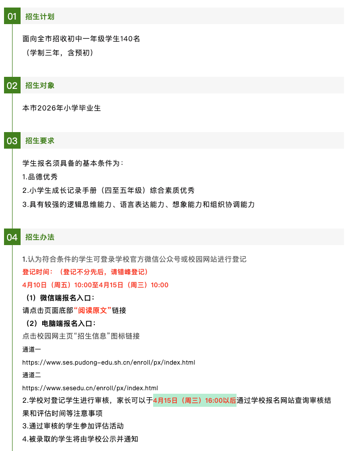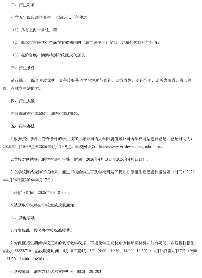 招生计划:面向全市招收初中一年级学生430名(浦东生源370.非浦东生源60)
