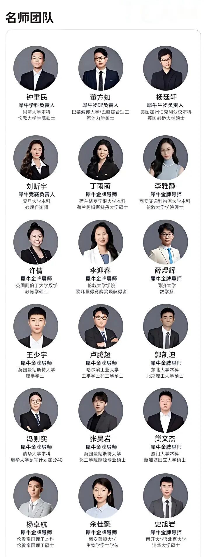 犀牛国际教育硬核实力所在,教职人员团队已超过400名,绝大多数毕业于QS世界排名前100学府,不乏来自港三新二、藤校G5以及清北复交的硕士、博士,确保了学术高度的纯粹性。